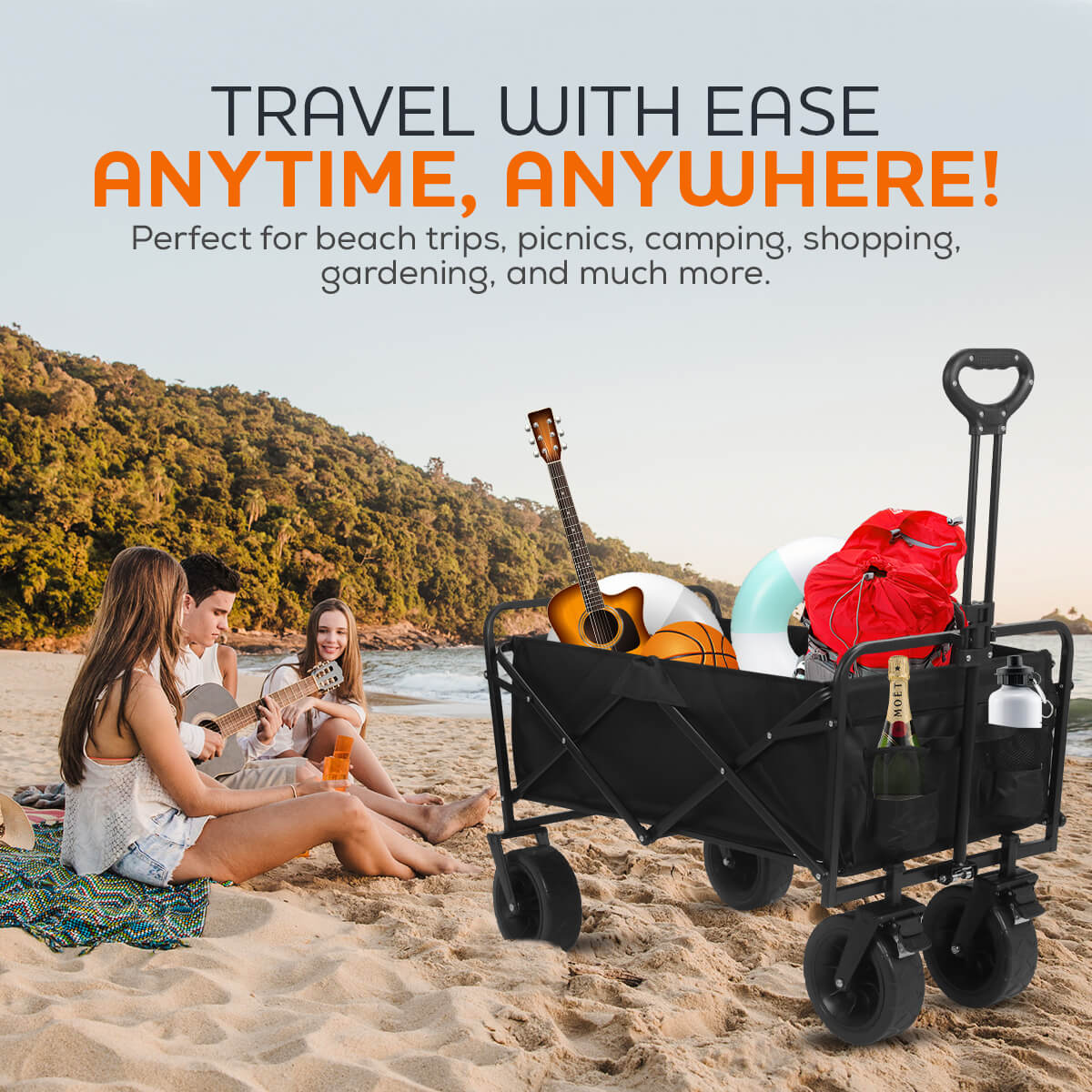 Yes! Thanks to the 360° front swivel wheels and sturdy build, it glides smoothly over sand, gravel, grass, and more. It’s made for tough terrain!